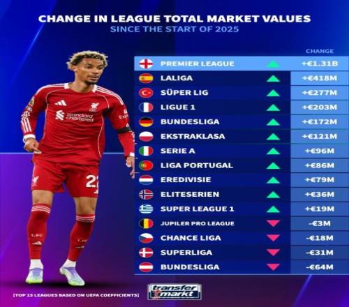 德转统计欧洲15大联赛2025年总身价涨跌榜: