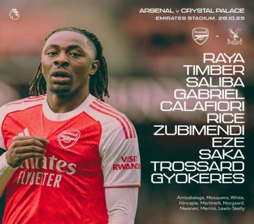 北京时间10月26日20:00,英超第9轮,领头羊阿森纳主迎强队拦路虎水晶宫。枪手公布先发,埃泽战旧主,萨卡、赖斯领衔,特罗萨尔先发。 阿森纳首发:拉亚/廷伯、萨利巴、加布里埃尔、卡拉菲奥里、赖斯、苏维门迪、埃泽、萨卡、特罗萨尔、哲凯赖什 替补:凯帕、莫斯克拉、本·怀特、因卡皮耶、马丁内利、内尔高、恩瓦内里、梅里诺、刘易斯-斯凯利