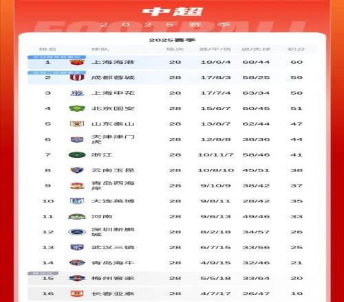 至此,本轮比赛,上海海港0分,成都蓉城1分,上海申花1分,北京国安0分。积分榜也因此有了微妙的变化,上海海港以60分继续领跑,成都蓉城追了一分,以59分位列第2位。上海申花58分,继续排在第3位。北京国安51分,维持在第4位。山东泰山47分排在第5位。